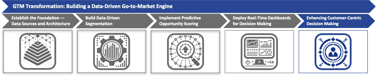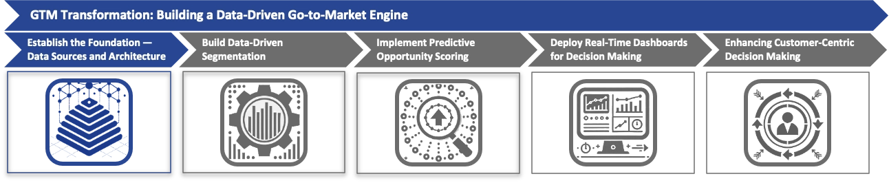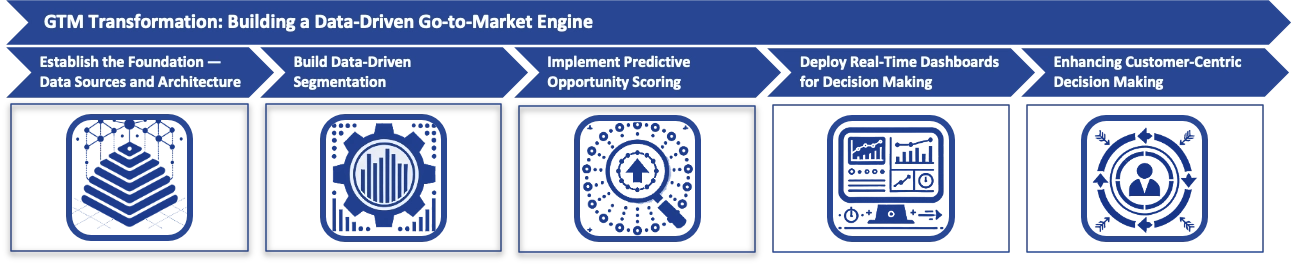 The process of building a data-driven Go-to-Market (GTM) strategy involves several structured steps. It begins by establishing a strong foundation of data sources and architecture, ensuring that data quality, integration, and governance are prioritized to create reliable insights. Next, the focus shifts to developing effective customer segmentation using both behavioral and firmographic data, supported by advanced analytics to refine customer profiles and target efforts more precisely. Predictive opportunity scoring is then implemented, leveraging historical data to rank opportunities based on their likelihood of success, which improves sales prioritization and efficiency. Real-time dashboards are deployed to provide decision-makers with instant access to key metrics, helping them make agile, data-driven decisions. Finally, organizations enhance their customer-centric decision-making by integrating qualitative and quantitative data to refine customer journey mapping and implement hyper-personalized outreach strategies, ultimately optimizing engagement and driving growth.