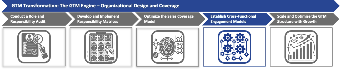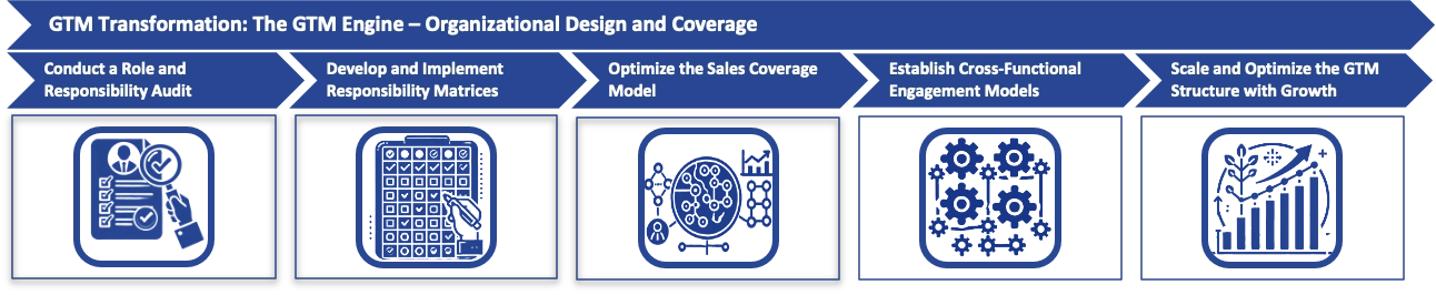 The next steps involve optimizing the sales coverage model and establishing cross-functional collaboration engagement models. Conducting thorough market analysis and selecting the most appropriate coverage model—whether geographic, industry-based, or account-based—ensures that sales efforts are aligned with market opportunities. Implementing structured collaboration frameworks and regular communication channels enhances coordination between GTM teams and other departments, fostering a cohesive and agile approach. Finally, scaling and optimizing the GTM structure over time involves continuous performance monitoring, feedback integration, and strategic adjustments to support growth and maintain alignment with the company’s objectives. This ongoing process ensures that the GTM engine operates efficiently and effectively as the organization evolves.