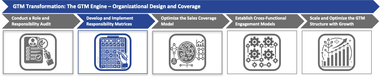 Optimizing the GTM structure in a high-growth organization requires a structured and iterative approach. The process begins with conducting a comprehensive role and responsibility audit to understand the current state of the GTM teams and identify gaps or overlaps in responsibilities. By mapping out existing roles and conducting a gap analysis, organizations can realign roles to ensure clarity and efficiency. Following this, developing and implementing responsibility matrices, such as RACI matrices, helps clarify who is responsible for each task, ensuring alignment and accountability across the organization.